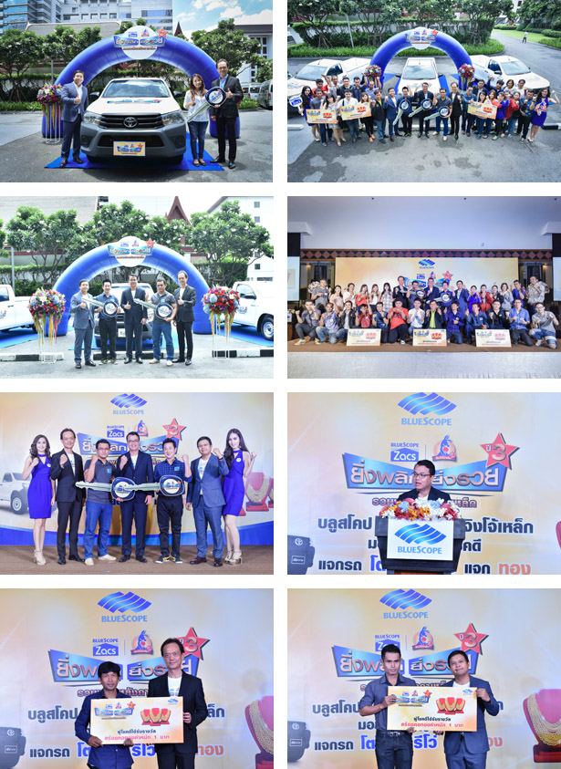 NS BlueScope (Thailand) recently held awards ceremony of BlueScope Zacs® and JingJoeLek® Promotion Campaign. Six months of this campaign starting from January to June 2016 with lots of customers across Thailand sending SMS of product code under roof sheet. There are 31 rewards which are Toyota Revo 3 cars and Gold necklaces 30 units for the lucky winners worth 2,265,000 baht. Somkiat Pintatham, country president gave the rewards to the lucky winners.