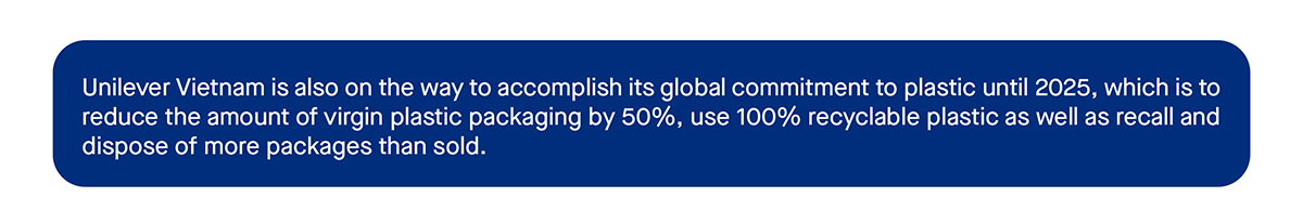 At Unilever Vietnam, the strategy to halve the environmental impact in production and business activities has been realized with a number of specific actions. Unilever’s factories are committed to not discharging waste into the environment and 100% of the factory’s emissions are carbon positive. The company also utilizes 48% of renewable energy and reduces the amount of water in production by 43%.