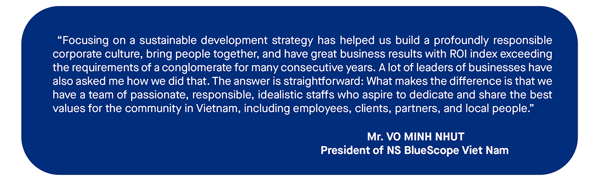 Mr. Vo Minh Nhut, President of NS BlueScope Vietnam said that it is time for the leaders of business to pay more attention on establishing an objective for their business, rather than simply focusing on profits. It does not imply that profit is not important, but it must and should come from doing the right thing, responsibility and creating sustainable values for the community, the economy as well as the planet. Therefore, green growth is the responsibility that businesses need to conduct to join hands and contribute to the above objectives.