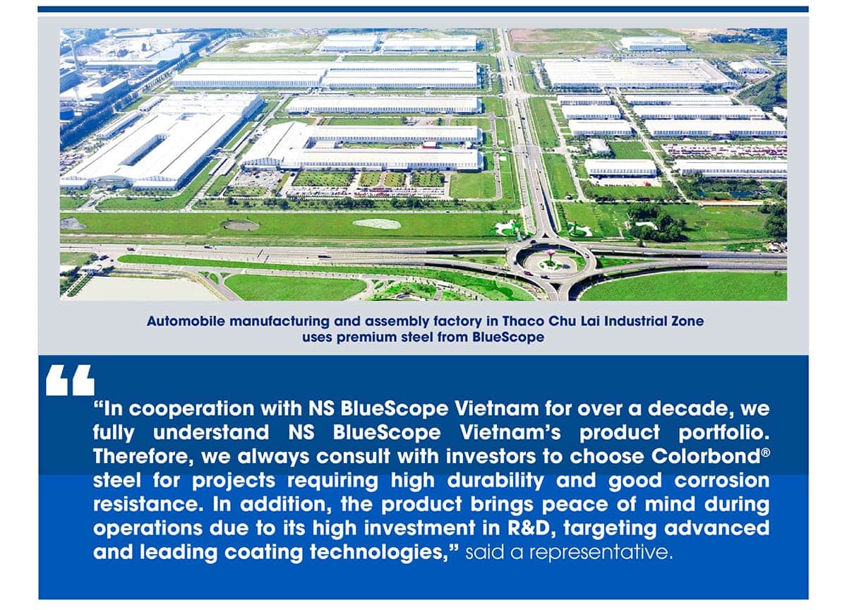 | In the first steps to creating a better future, it is impossible not to mention the iconic works in Vietnam, which are a testament to the effective relationship between NS BlueScope Vietnam and its contractors. | That imprint is present in many industries and sectors all over the country, including the tallest building in Vietnam – Landmark 81 in Saigon, Thaco’s automobile assembly plant in the Central region, or Vinfast’s factory with a scale of over half a million m2 in Hai Phong city. |