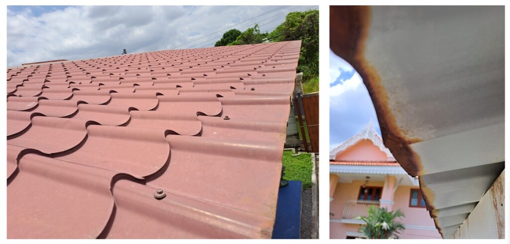 หลังคาเมทัลชีทไม่ได้คุณภาพอายุ 2 ปี สีเริ่มซีด หลุดเป็นผง เริ่มมีสนิมที่ปลาย