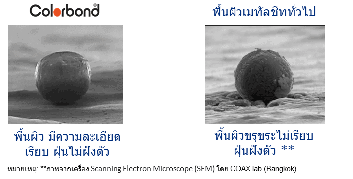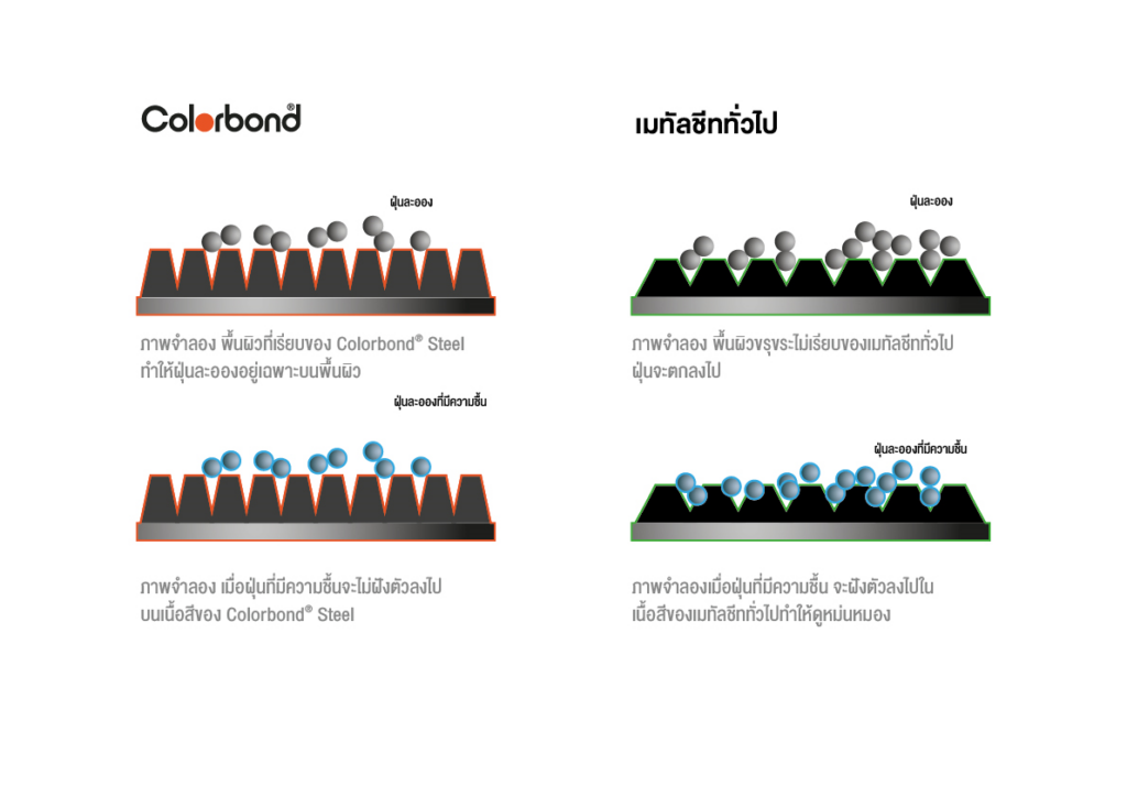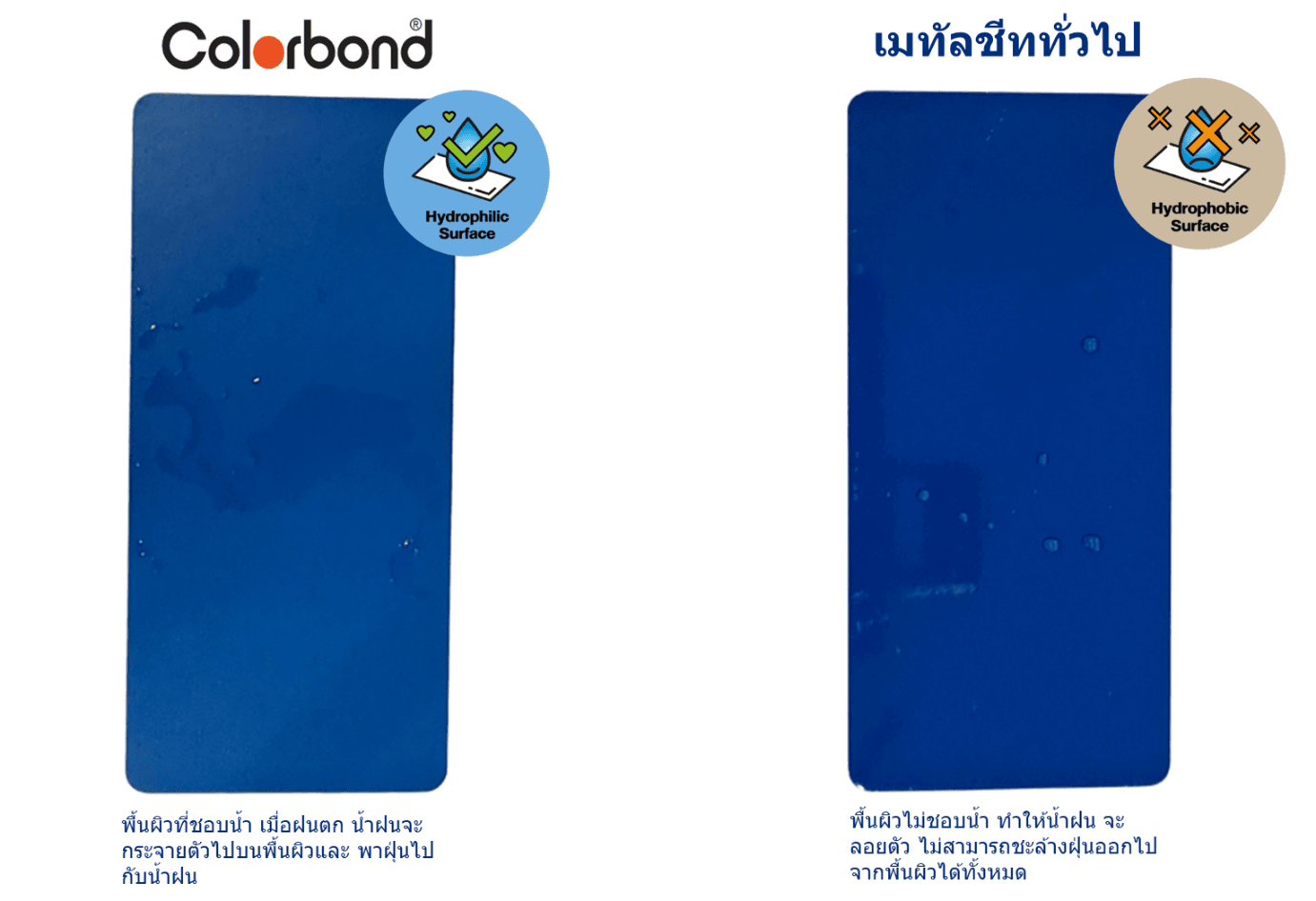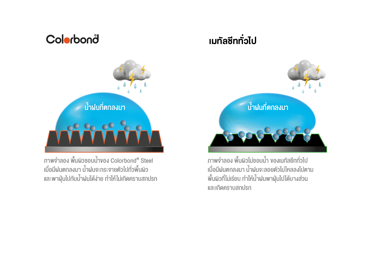 พื้นผิว ที่น้ำไม่กระจายตัว (เมทัลชีททั่วไป) ทำให้น้ำไม่สามารถพาฝุ่นและ คราบสกปรก ออกไปจากพื้นผิวได้ ทำให้ตกค้างและ สะสมจนเป็นคราบดำแลดูไม่สวยงาม แต่สำหรับ Colorbond® Steel เมื่อมีฝนตกลงมาด้วยสมบัติพิเศษของสีจะทำให้ น้ำฝนจะกระจายตัวไปทั่วแผ่น และฝุ่นที่อยู่บนพื้นผิวจะถูกชะล้างไปพร้อมกับน้ำฝน ทำให้ไม่เกิดคราบดำ คราบบนพื้นผิว เมื่อเทียบกับเมทัลชีททั่วไป