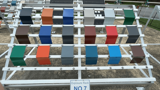 - สภาวะจำลองหรือที่เรียกกันว่า Exposure Rack โดยจะมีการติดตัวอย่างทั้ง เมทัลชีท Colorbond® Steel และเมทัลชีททั่วไป ในที่ๆเดียวกัน โดยจะมีการสังเกตุ เก็บข้อมูล บันทึกผลเป็นระยะเวลาทุกๆ 1 เดือน เพื่อประเมินคุณภาพเมทัลชีท