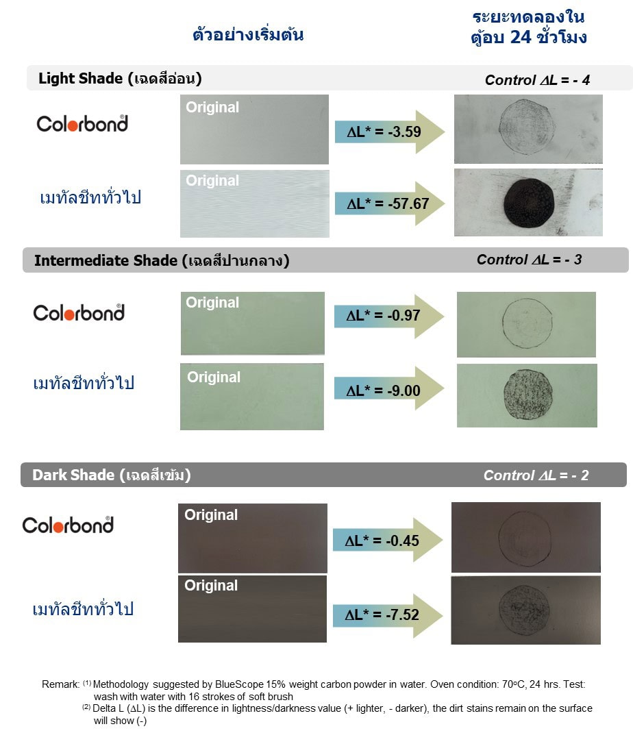 จากรูปจะเห็นได้ว่าเมทัลชีท Colorbond® Steel นั้นที่มี Clean Technology เมื่อปล่อยทิ้งไว้เป็นระยะเวลากว่า 16 เดือน นั้นอาจจะมีคราบฝุ่นตกลงมา และเมื่อมีฝกตกลงมา น้ำฝนจะซะล้างสิ่งสกปรกออกไปโดยไม่ทิ้งคราบไว้บนแผ่นเมทัลชีท Colorbond® Steel แต่เมทัลชีททั่วไปจะเกิดคราบดำเมื่อมีฝุ่นเกาะสะสมและ โดยน้ำฝนชะล้างลงมา