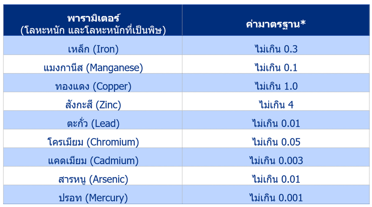 *หน่วยวัด: มิลลิกรัม ต่อลิตร ; อ้างอิง: WHO: Drinking-water quality guidelines