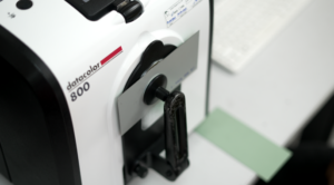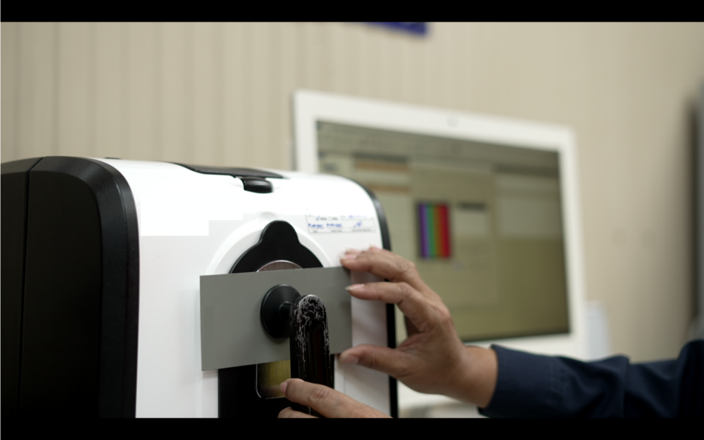 ขั้นตอนที่ 5  : นำแผ่นตัวอย่างที่แห้งแล้วเข้าเครื่องวัดค่าสี (Datacolor Spectrophotometer๗ เพื่อตรวจสอบค่าความสว่าง (L*) ที่เปลี่ยนแปลงไปจากแผ่นตัวอย่างตั้งต้นในขั้นตอนที่ 1  หรือที่เรียกว่าค่า Delta L* (DL*)  โดยค่า Delta L* ติดลบ (-) แสดงถึงสีที่ดำเข้มขึ้น หรือหม่นหมองขึ้น