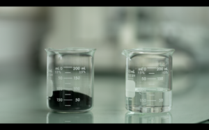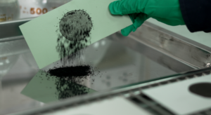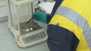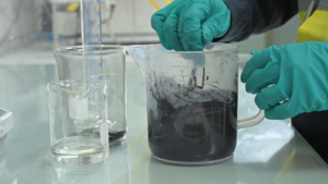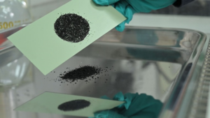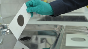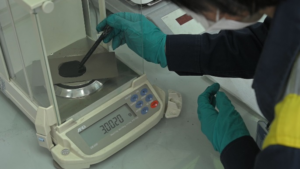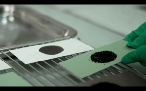 ขั้นตอนที่ 2 : นำผงคาร์บอนมาผสมน้ำในอัตราส่วน 15 กรัมต่อน้ำ 1 ลิตร  และ นำมาหยดลงบนเมทัลชีทตัวอย่างทั้งหมด ให้ได้น้ำหนักสารละลาย 3 กรัมที่เท่าๆกัน เสมือนเป็นฝุ่นละอองที่โดนความชื้นตกลงบนหลังคาเมทัลชีท