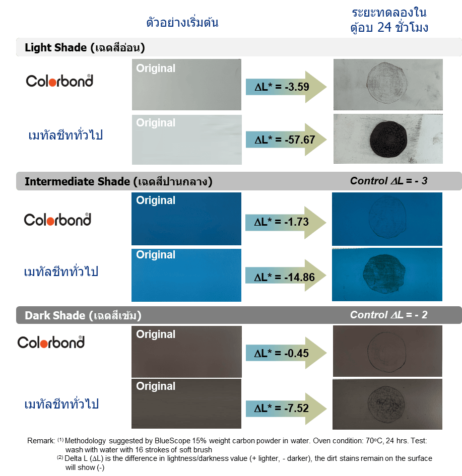 จากการทดสอบ เมื่อดูด้วยตาเปล่าจะเห็นว่าประสิทธิภาพของ Clean Technology ของ Colorbond® Steel สามารถช่วยให้ผงคาร์บอนไม่สามารถฝังตัวลงไปในเนื้อของพื้นผิวได้ ทำให้ทิ้งคราบสกปรกน้อยกว่า เมทัลชีททั่วไปที่ ผงคาร์บอนจะฝังตัวและ ล้างออกได้ยาก ซึ่งค่า Delta L* (DL*)  ที่ได้จาก Colorbond® Steel มีค่าลบน้อยกว่า ซึ่งหมายถึง หม่นหมองน้อยกว่า เมทัลชีททั่วไป (ค่าลบน้อยหมายถึงใกล้เคียงกับสภาพเริ่มต้นมากที่สุด)