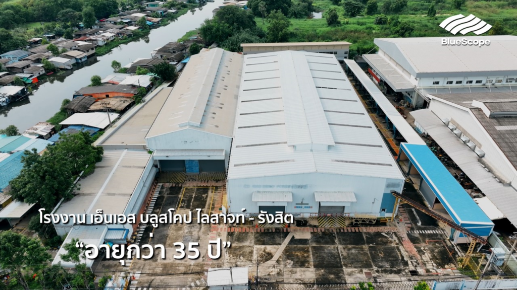 โรงงาน บริษัท เอ็นเอส บลูสโคป ไลสาจท์ (ประเทศไทย) จำกัด ที่รังสิต จังหวัดปทุมธานี ใช้เมทัลชีท Colorbond® Steel อายุ 35 ปี ยังไม่เกิดสนิม
