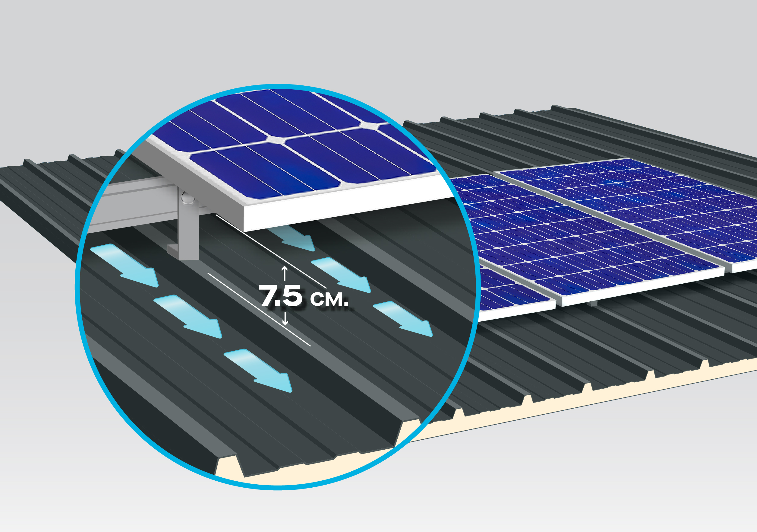 - ช่องว่างระหว่างสันลอนหลังคาถึงระบบแผงโซล่าเซลล์ ควรมีความห่างมากกว่า 7.5 เซนติเมตร เพื่อลดการสะสมของใบไม้หรือสิ่งต่างๆ ที่จะมาติดอยู่ด้านล่างของแผงโซล่าเซลล์ รวมถึงเพื่อให้น้ำสามารถไหลผ่านหลังคาเมทัลชีทได้ เวลาฝนตกหรือระหว่างการล้างทำความสะอาด และลดโอกาสในการที่ลมจะพัดสอดเข้าใต้แผงโซล่าเซลล์แล้วทำให้แผงหลุดออกจากหลังคาและเกิดความเสียหายได้