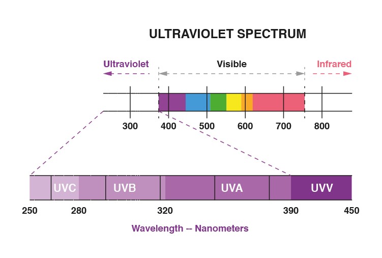 เรารู้จักรังสียูวี (UV) หรือรังสีอัลตราไวโอเล็ท (Ultraviolet) กันอยู่แล้วจากการใช้ชีวิตประจำวันที่ต้องคอยป้องกันหรือหลีกเลี่ยงมัน แสงแดดจากดวงอาทิตย์คือจุดเริ่มต้นของรังสีเหล่านี้ เมื่อพิจารณาแสงในลักษณะของคลื่นแม่เหล็กไฟฟ้า เราจะแบ่งแสงได้ 3 ช่วงคือ รังสีในช่วง ‘อินฟราเรด’ (Infrared radiation) คิดเป็น 45% ของแสงแดด มีความยาวคลื่นตั้งแต่ 700 นาโนเมตรขึ้นไป ดวงตามนุษย์มองไม่เห็น แต่จะให้ความรู้สึกถึงความร้อนที่ผิวหนัง, ‘แสงขาว’ หรือรังสีในช่วงที่มองเห็นได้ (Visible light) คิดเป็น 50% ของแสงแดด มีความยาวคลื่น 400-700 นาโนเมตร ดวงตามนุษย์มองเห็นได้และสามารถจำแนกได้เป็น 7 สี ตามสีรุ้งหรือที่เรียกว่าสเปกตรัม และรังสีในช่วง ‘อัลตราไวโอเลต’ คิดเป็น 5%ของแสงแดด มีความยาวคลื่นในช่วง 100-400 นาโนเมตร ดวงตามนุษย์มองไม่เห็นแต่เป็นอันตรายต่อพื้นผิวของสิ่งต่าง ๆ มากที่สุด