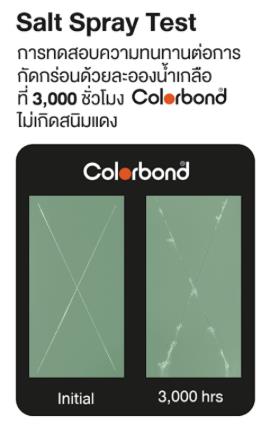 บริษัท เอ็นเอส บลูสโคป (ประเทศไทย) จำกัด ร่วมกับสถาบันเหล็กและเหล็กกล้าแห่งประเทศไทย (Iron and Steel Institute of Thailand) ทำการทดสอบความทนละอองน้ำเกลือ อ้างอิงมาตรฐาน ASTM B 117-2016 Standard Practice for Operating Salt Spray (Fog) Apparatus โดยได้ทำการทดสอบผลิตภัณฑ์เหล็กเคลือบสีคัลเลอร์บอนด์ (COLORBOND®Steel) เป็นระยะเวลาสูงสุด 3,000 ชั่วโมง และผลิตภัณฑ์เหล็กเคลือบซิงคาลุม (ZINCALUME®Steel) เป็นระยะเวลาสูงสุด 2,000 ชั่วโมง, โดยไม่พบสนิมแดงจากรอยกรีด เราจึงกล้าให้การรับประกันการไม่ผุเป็นรูพรุนอันเนื่องมาจากการกัดกร่อน สูงสุดถึง 35 ปี จึงมั่นใจได้ว่าผลิตภัณฑ์ของบลูสโคป ทนทาน ยาวนาน ส่งต่อถึงรุ่นลูกรุ่นหลานได้เลย