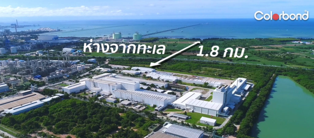 โรงงาน บริษัท เอ็นเอส บลูสโคป (ประเทศไทย) จำกัด ที่นิคมอุตสาหกรรม ห่างจากทะเล 1.8 กิโลเมตร ใช้เมทัลชีท Colorbond® Steel สี off white มาตั้งแต่ปีพ.ศ. 2531 ยังไม่เกิดสนิม