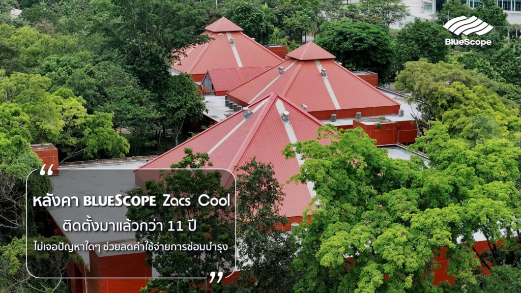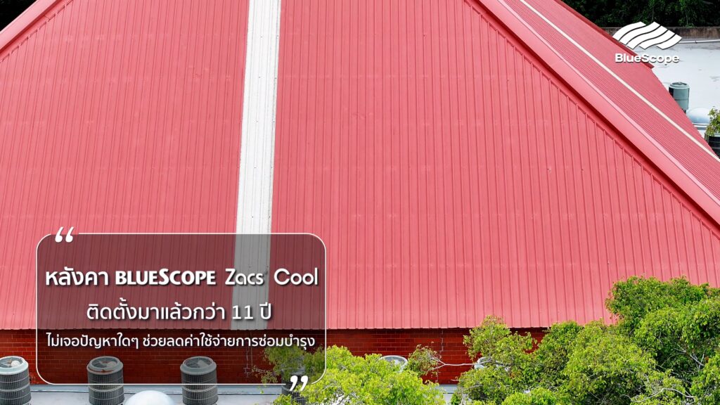 จากการสำรวจอาคารหลักที่ใช้บลูสโคป ยังไม่พบปัญหาเรื่องการผุ ไม่เป็นสนิม สีสันยังคงสวยงาม