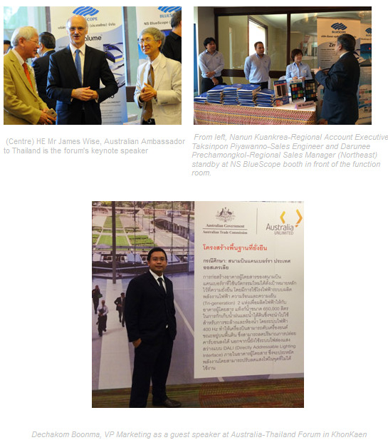 บริษัท เอ็นเอส บลูสโคป (ประเทศไทย) จำกัด ได้รับเชิญจากสำนักงานการพาณิชย์ออสเตรเลีย ประเทศไทย (Austrade) เข้าร่วมบรรยายในงานเสวนาออสเตรเลีย-ไทย ภายใต้หัวข้อ “การพัฒนาเมืองและขนส่งมวลชนเพื่ออนาคตของ มหานครขอนแก่น” เมื่อวันที่ 5 มิถุนายน ที่โรงแรมพูลแมน ราชา ออร์คิด ขอนแก่น โดยมีวัตถุประสงค์เพื่อแลกเปลี่ยนประสบการณ์และศักยภาพตลอดจนเทคโนโลยีการผลิตของประเทศออสเตรเลียที่เกี่ยวข้องกับการพัฒนาเมือง โครงสร้างพื้นฐาน และระบบขนส่งมวลชน เพื่อสร้างความสัมพันธ์อันดีของภาคธุรกิจเอกชนในจังหวัดขอนแก่นกับประเทศออสเตรเลียในการที่จะร่วมกันพัฒนาขอนแก่นให้มีความพร้อมรองรับการเติบโตของสังคมเมือง