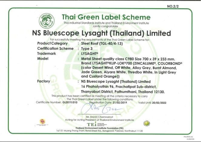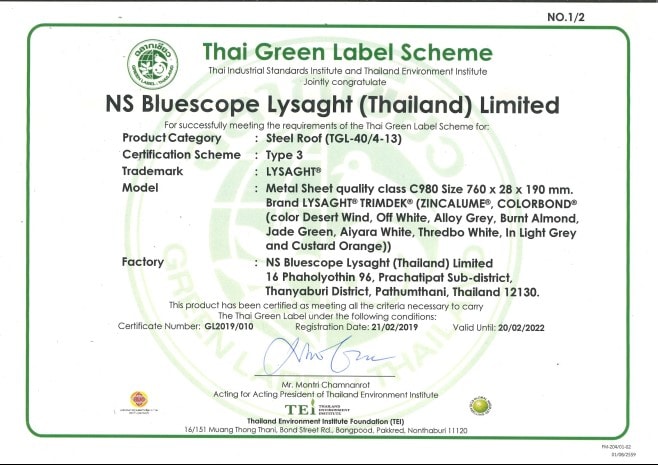 หลังคาเหล็กที่เป็นมิตรต่อสิ่งแวดล้อม เจ้าแรกและเจ้าเดียวในประเทศไทย ที่ได้ขึ้นทะเบียนและเผยแพร่ผ่านเว็บไซต์ Thai ECO Products
