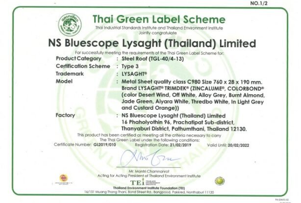 Thailand หลังคาเหล็กที่เป็นมิตรต่อสิ่งแวดล้อม เจ้าแรกและเจ้าเดียวในประเทศไทย ที่ได้ขึ้นทะเบียนและเผยแพร่ผ่านเว็บไซต์ Thai ECO Products