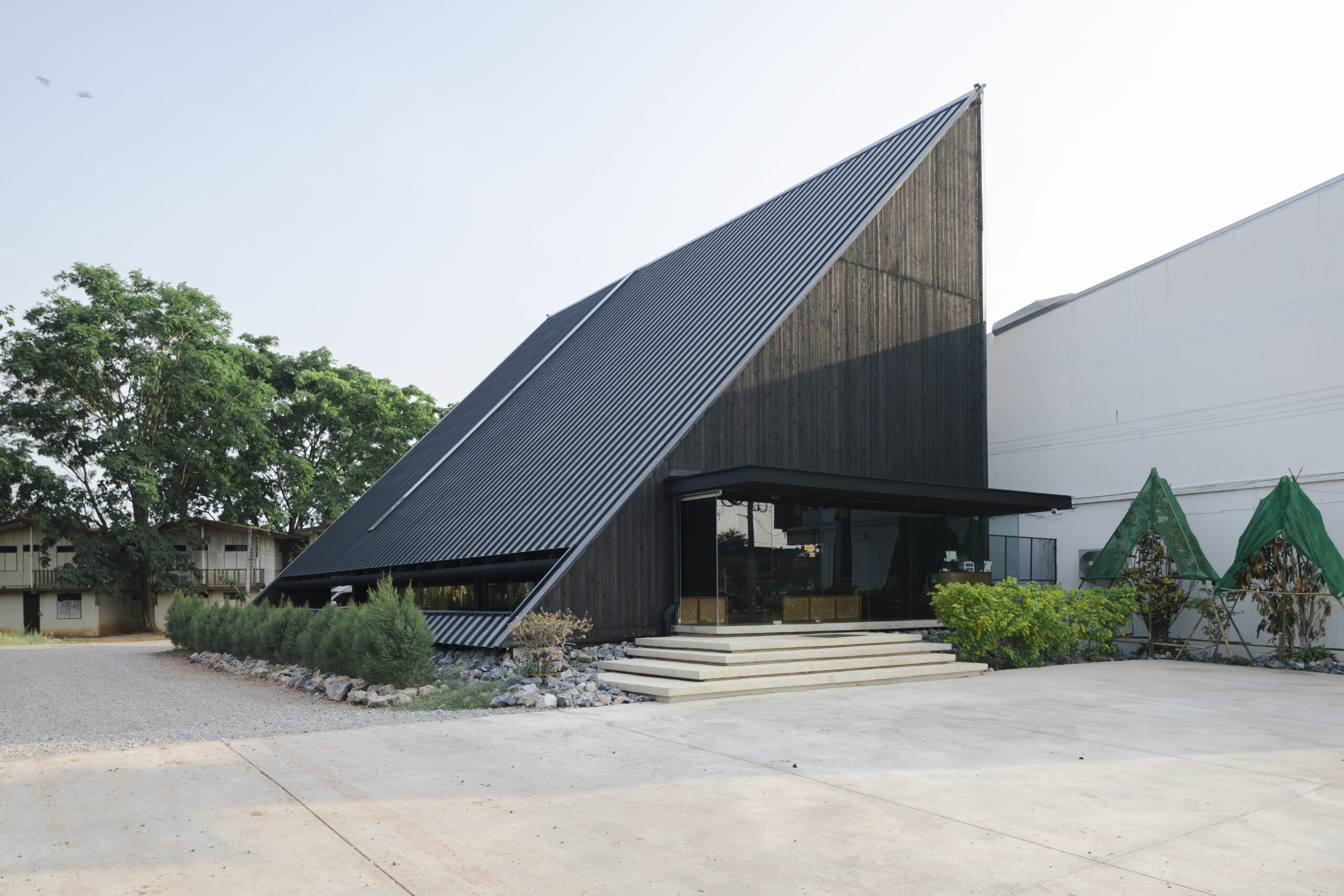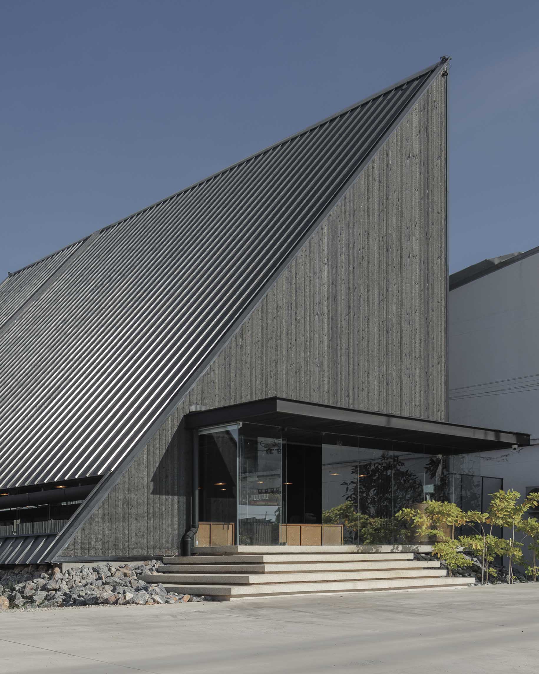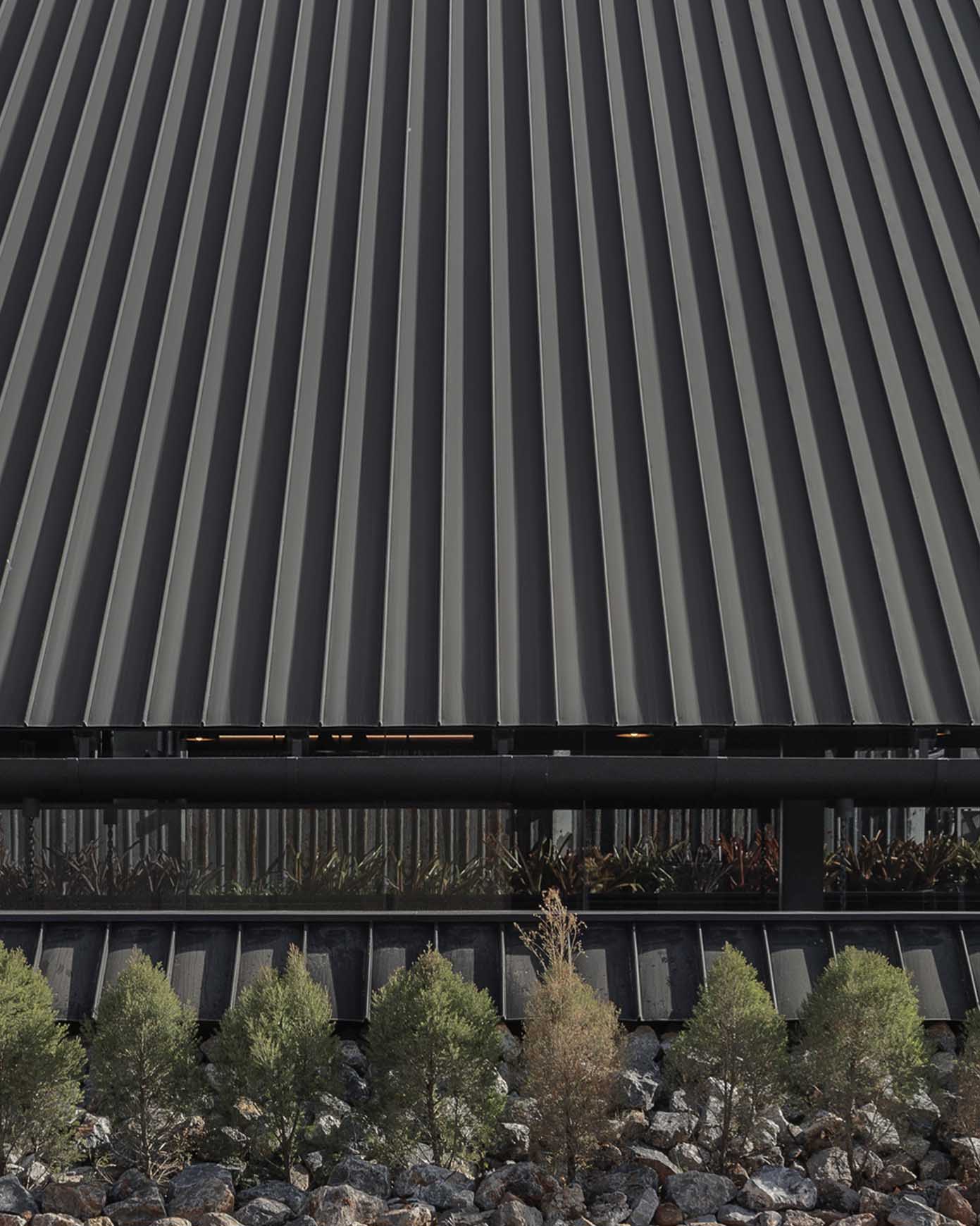โครงสร้างแบบทรงจั่วลาดเอียงขนาดใหญ่ช่วยเพิ่มความโดดเด่นให้กับตัวอาคาร โดยอาคารหลังนี้นำ COLORBOND® steel มาใช้เป็นวัสดุหลัก โดยเลือกใช้สีดำ สี Night Sky ที่ให้ความรู้สึกเรียบหรู เพิ่มมิติให้กับตัวอาคารและ COLORBOND® steel สามารถทนต่อสภาพอากาศที่หลากหลายได้ดี ทั้งแสงแดด ฝน หรือแรงลม นอกจากนี้ การเลือกใช้สีดำและวัสดุเมทัลชีทยังช่วยสะท้อนแนวคิด สถาปัตยกรรมโมเดิร์น ที่เน้นความเรียบง่ายแต่ทรงพลัง และยังเป็นการออกแบบที่ช่วยให้การไหลเวียนของน้ำฝนเป็นไปอย่างมีประสิทธิภาพ