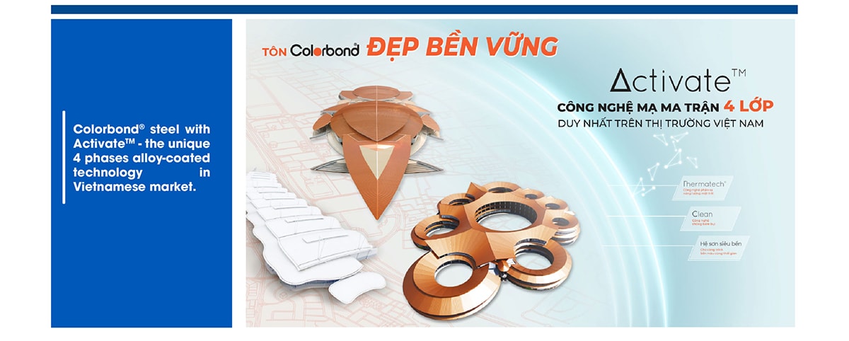 The challenges of the Covid-19 pandemic are expected to persist in 2022, as well as the price of raw materials continuing to increase. In this context, NS BlueScope Vietnam continues to accompany contractors on their journey by investing in R&D and market research to optimize current products and add new products to the portfolio according to market demand. Colorbond® steel with Activate™ – the unique 4 phases alloy-coated technology – has impressed contractors thanks to its outstanding corrosion resistance, ensuring the longevity of buildings, and keeping its aesthetics over time.