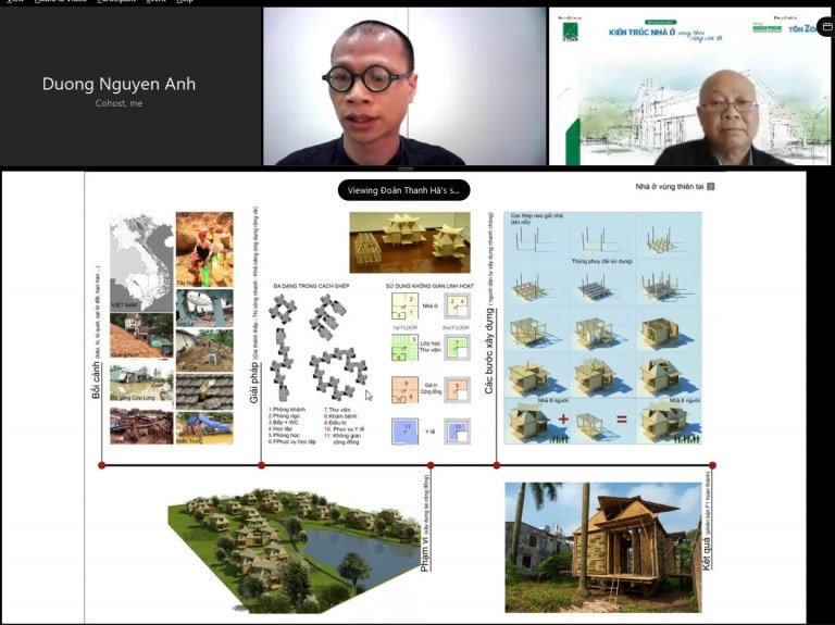 Đồng ý kiến với KTS Nguyễn Văn Tất, KTS Đoàn Thanh Hà – Sáng lập & Kiến trúc sư trưởng H&P Architects cũng cho rằng cần chú trọng đến các đặc trưng kiến trúc nhà ở vùng ven đô, đồng thời giới thiệu tới khách mời mô hình nhà ở nhỏ theo modun. Những mô hình ảnh thường sử dụng vật liệu tiết kiệm chi phí như gạch mộc, khung thép, cũng như có thể ứng dụng thêm các công nghệ tiết kiệm năng lượng như tấm pin năng lượng mặt trời, hệ thống thu gom nước mưa…vv phù hợp với điều kiện kinh tế ở khu vực ven đô.