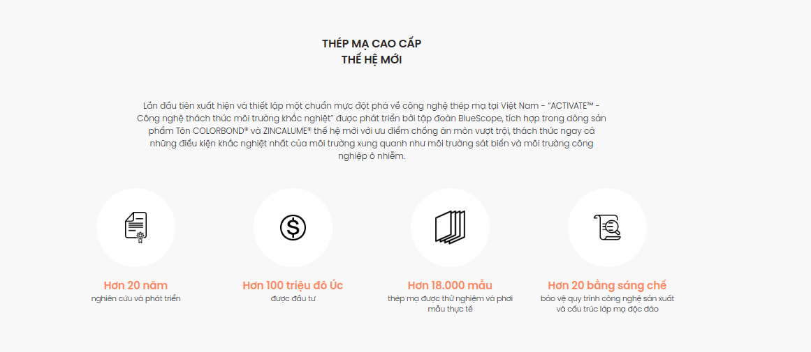 Lần đầu tiên xuất hiện và thiết lập một chuẩn mực đột phá về công nghệ thép mạ tại Việt Nam – “Activate™ – Công nghệ thách thức môi trường khắc nghiệt” được phát triển bởi tập đoàn BlueScope, tích hợp trong dòng sản phẩm tôn COLORBOND® và ZINCALUME® thế hệ mới với ưu điểm chống ăn mòn vượt trội, thách thức ngay cả những điều kiện khắc nghiệt nhất của môi trường xung quanh như môi trường sát biển và môi trường công nghiệp ô nhiễm.